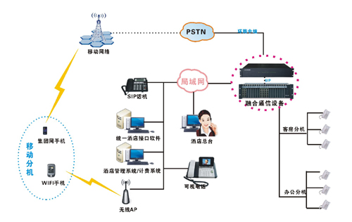 - 與PMS進行信息交互,使IP-PBX系統與酒店原有系統徹底融合,同時可以對現有系統進行平滑升級,保證酒店的投資。提供IP終端租賃或使用軟電話方式,為這些機構提供免費通信服務,同時在IP-PBX融合平臺的支持下,客人可以享受會議、視頻、語音信箱等特殊服務