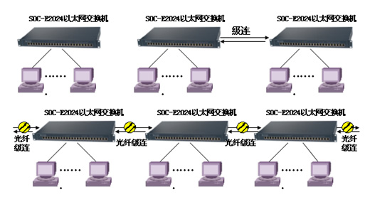 SOC-E2024(M)型以太網交換機具有帶網絡管理功能和不帶網絡管理功能的兩類交換機,即可以單獨使用,也可集中使用以便組建更大的網絡。其中帶網絡管理功能的以太網交換機具有兩個單模或多模光纖接口。非常適用組建大型遠距離局域網。